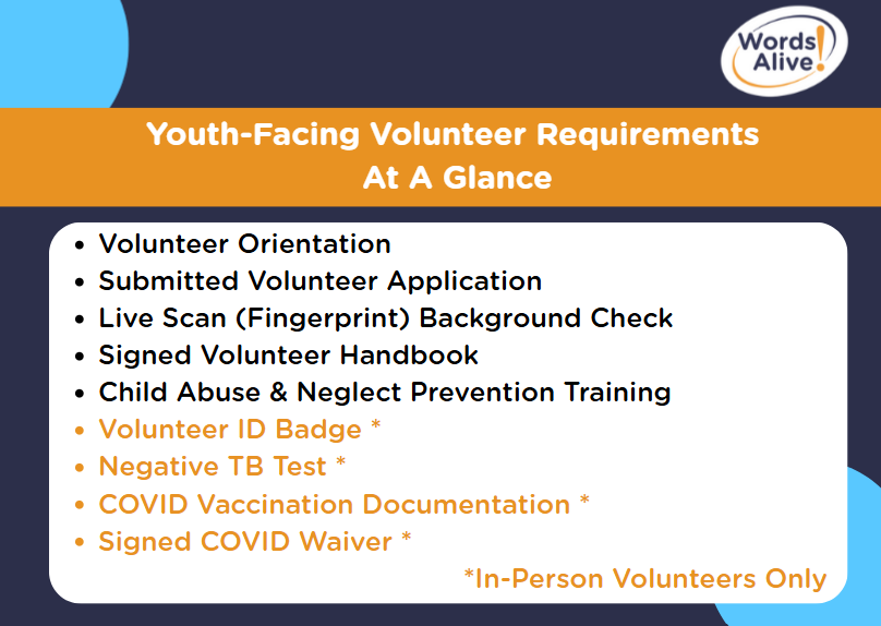 Thank you for volunteering with Words Alive! On this page, please find the requirements for volunteering with children, teens, and families. There are five requirements for all volunteers and four additional requirements for in-person volunteers.